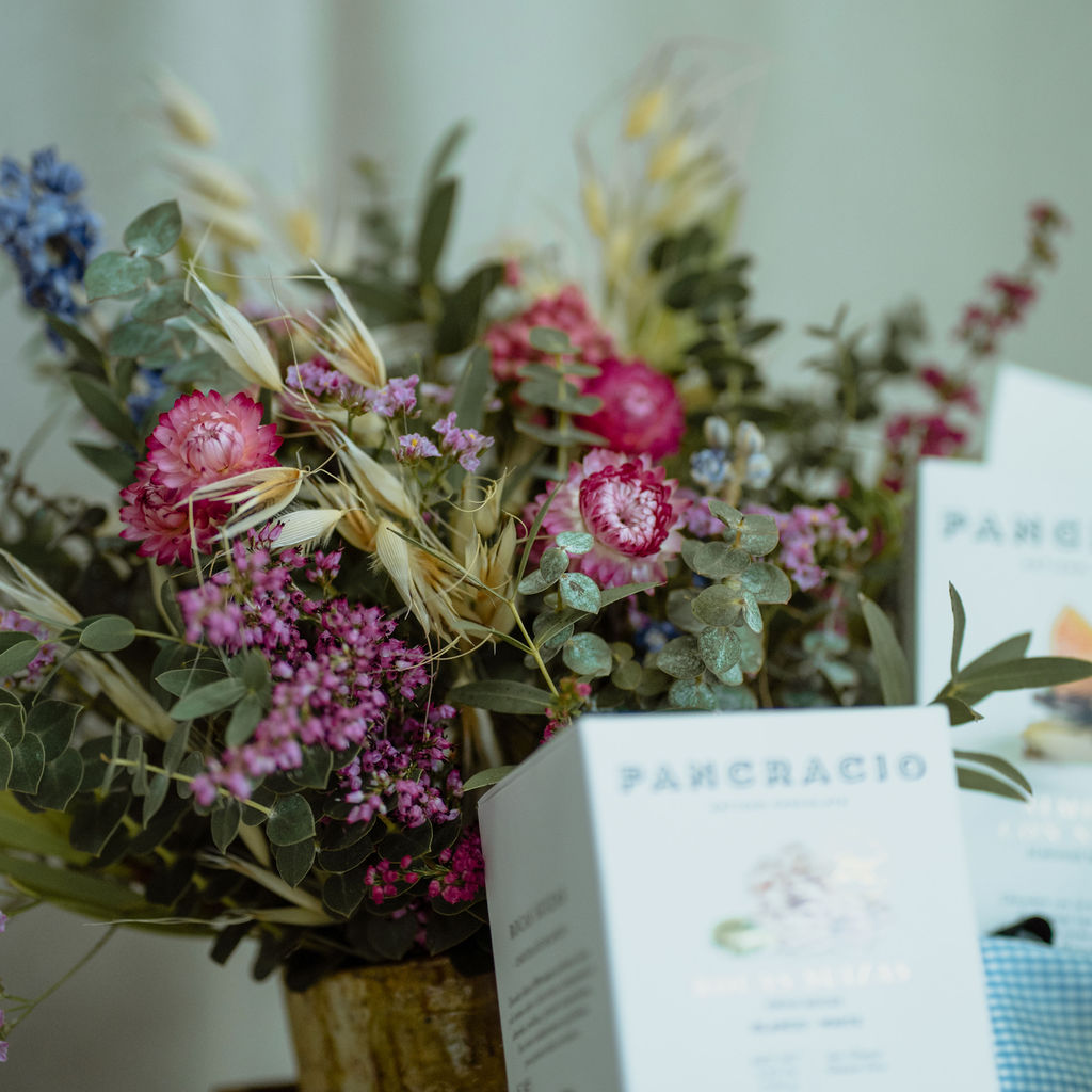 Dos jarroncitos con flores preservadas, combinadas con otras naturales duraderas y verdes variados.