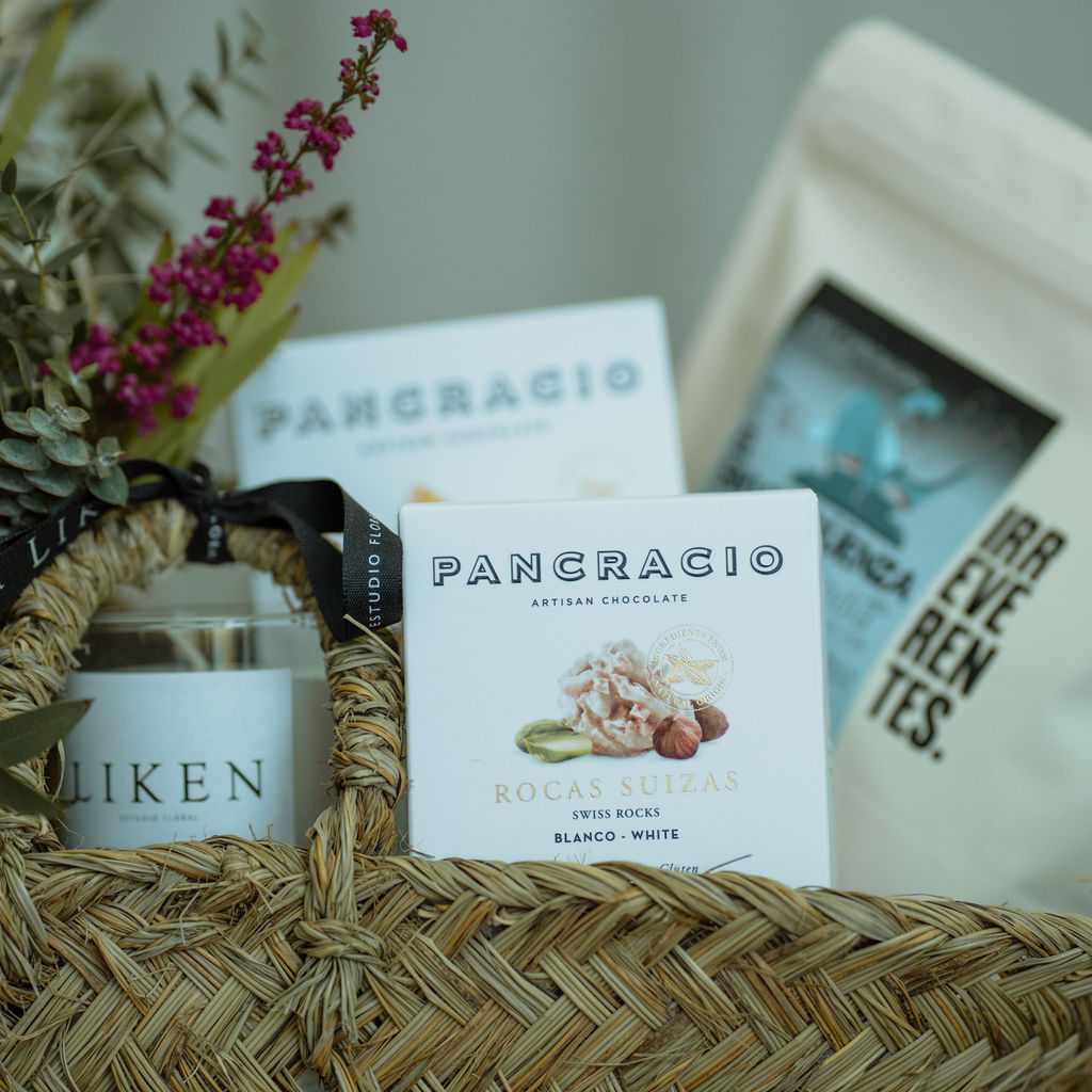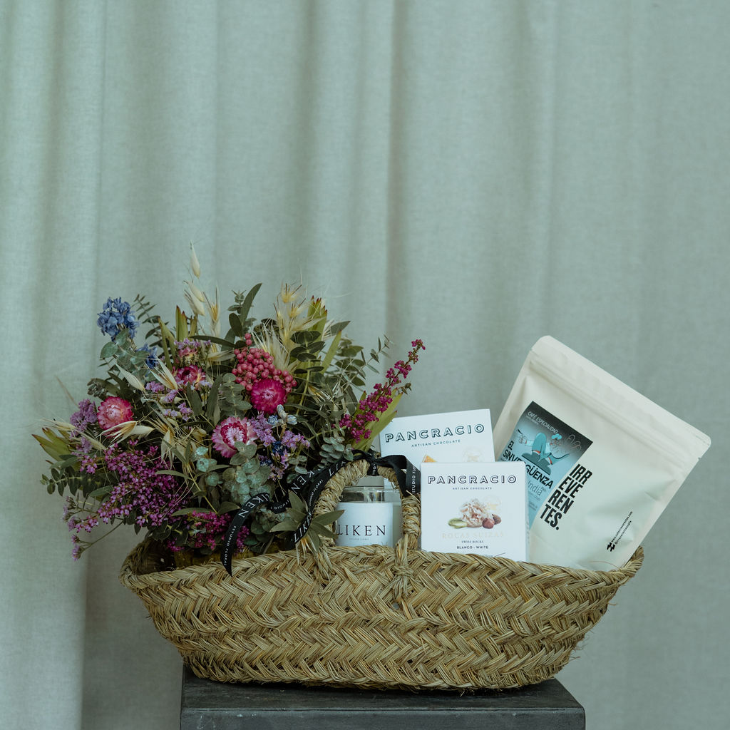 Cesto de esparto artesano con el increíble café «IRREVERENTES», flores, vela y chocolates Pancracio.